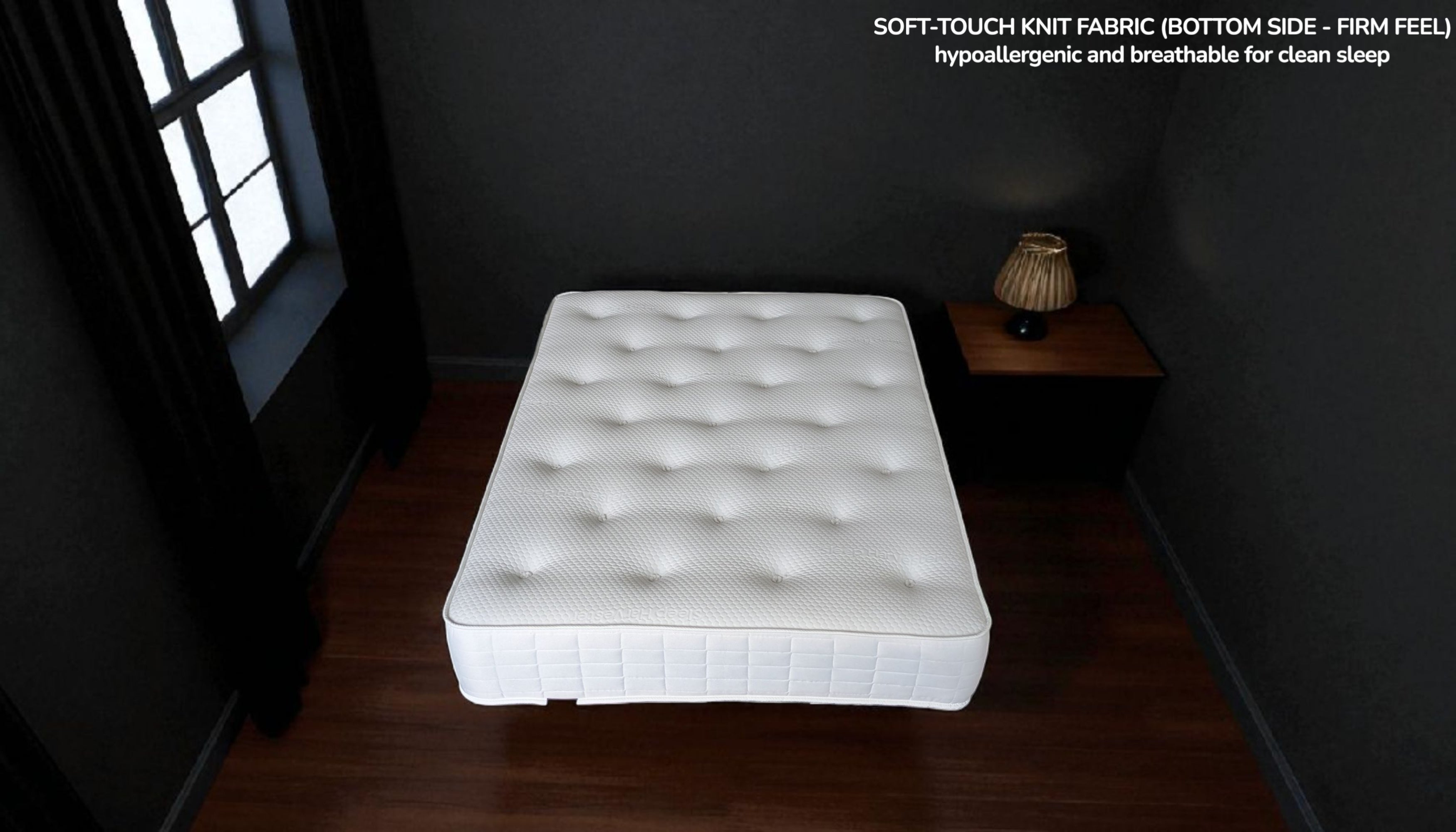 LEONORE 1000 is wonderfully designed with dual comfort feel - medium firm on one side (natural Bamboo fabric surface) and firm on other side (soft-touch knit fabric surface). The medium firm side of this mattress offers a perfect balance between support and comfort. The firm side of this mattress provides much needed firm support for pain relief. We combined different feel materials to design this LEONORE 1000 mattress so that it offers a perfect medium firmness for enhancing your comfort level and support regime as well as firm sleeping side for your body pain relief.